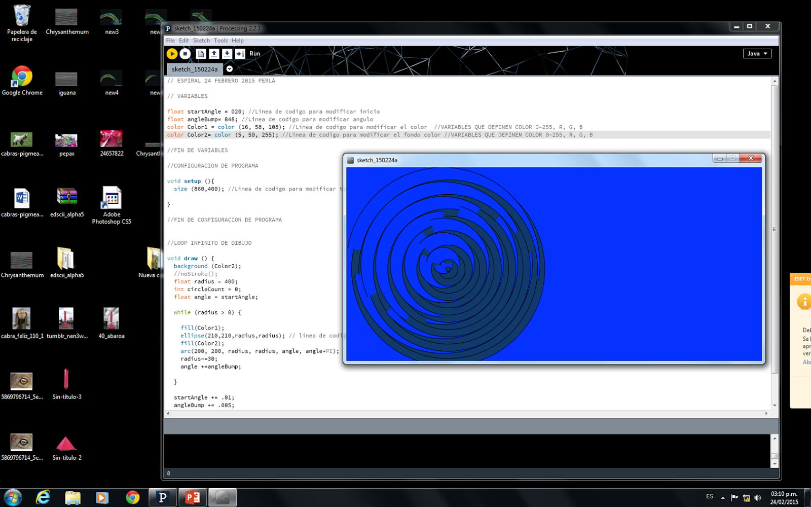 Con la ayuda PROCESSING, el cual es un ejemplo de lenguaje de programación que sirve para producir diferentes proyectos de diseño digital asi como también de multimedia e interactivos se creo un espiral que estuviera en constante movimiento. El programa es de fácil utilización, sólo se fueron introducioendo las órdenes o comandos que indicaban especificaciones como el color, tanto de la línea del espiral, el relleno y fondo del area, tamaño, circunferencia, forma, etcétera.